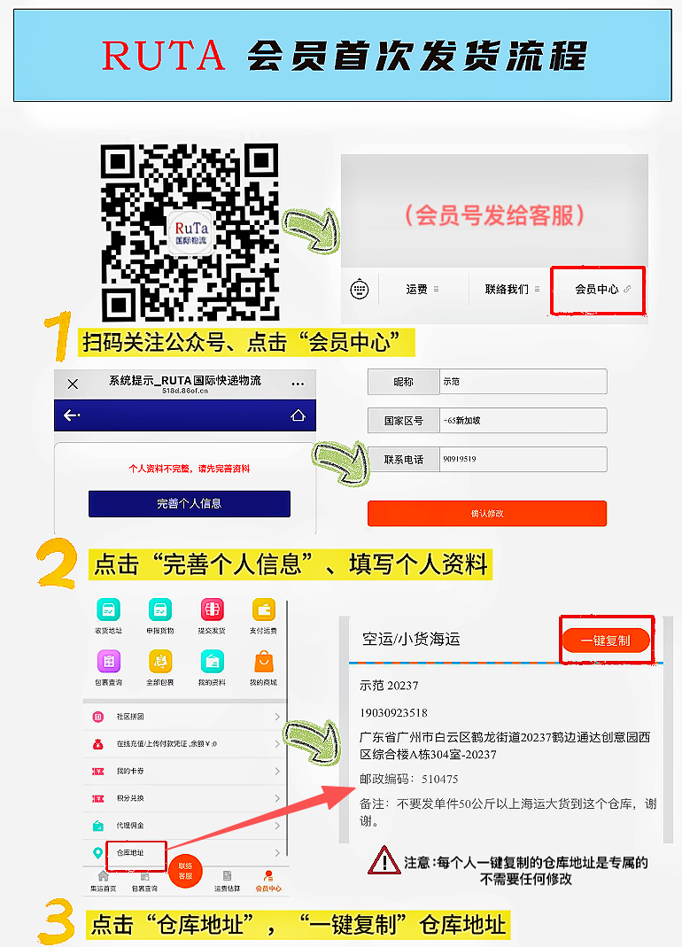 每个顾客都有自己的独有唯一地址,请到这里查看:微信公众号--会员中心--仓库地址: