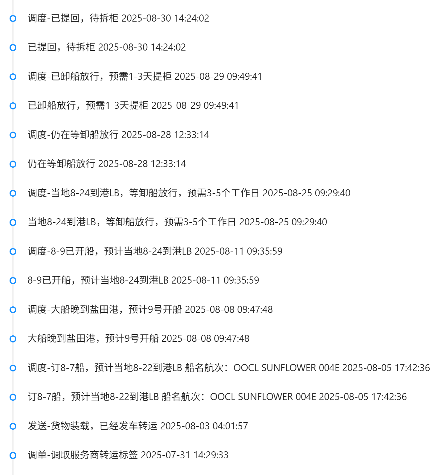 全程35-40天,全流程可以在我们的物流系统查询,物流轨迹如下,虽然时间很长,但是客户可以随时查看包裹到哪里了,预计何时可以收到: