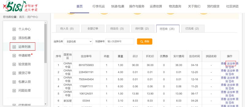 送货单位置:会员中心--运单列表--待出仓/待签收