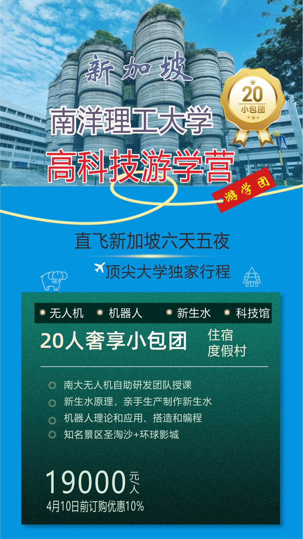 | 早餐后,南洋理工大学参与无人机体验课程学习。 四翼遥控飞机飞行汇报和模拟飞行系统实践反馈 挑选最佳飞行员参加迷你飞行比赛并总结和反馈 下午:【新生水环保教育讲座】 作为全世界首个使用“新生水”的国家,新加坡国内和海外都对这一举措一片哗然。参加游览,了解更多这个新加坡创举背后的成功故事。 将在导游的带领下,通过展览中心的多感官的视听感受和一个虚拟指导下踏上“新生水”的发现之旅。游客将了解到公众如何影响了高级膜技术的开发从而研发出新生水。展览中心里还设置了一个新生水工厂让游客亲眼目睹并亲手操作新生水的生产。此外 ,更让游客激动的是他们还可触摸、使用并品尝新生水。此外,展览中心还以播放多媒体录像和互动游戏方式让游客更深的了解新生水的所有知识。(如旺季讲座席位爆满 ,则可能换为滨海堤坝永续馆参访行程) 【新加坡国家图书馆】主馆位于市中心的培英街和密骆路之间,是目前东南亚规模最大、设施最先进的图书馆。国家图书馆主馆大楼高 16 层 ,四面均用玻璃围墙、祧高天花板和风洞设计 ,以达致良好的采光和风调效果。在顶楼的天台上还建有多个空中花园 ,红花绿草 ,既美化环境,又能发挥降低建筑温度的作用;其设计曾荣获新加坡“环保成就白金奖”。小朋友的阅览室是一棵大树的树洞 ,走进大树下裡面,可以隨意拿本书 ,隨意找个树屋坐下。任你爬上爬下随处趁凉。每一区的书都是一颗树 ,还可以坐在磨菇上读书。在这种充满着趣味的环境里,孩子们可以尽情放飞自己的想象 ,感受阅读的快乐 。 |