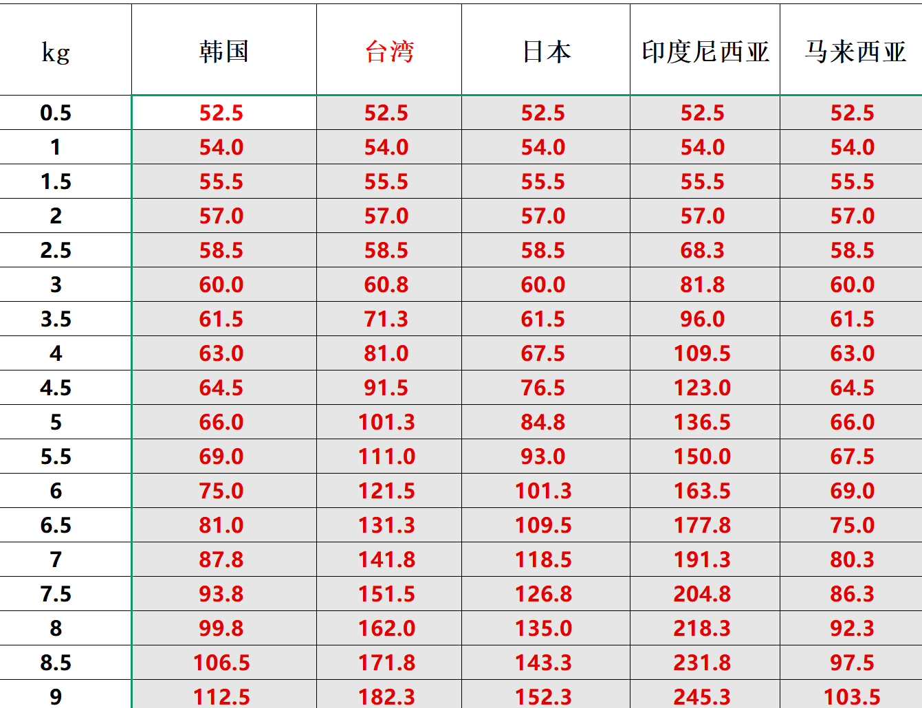 1、多个国家固定重量段,不同价格无任何规律和关联: